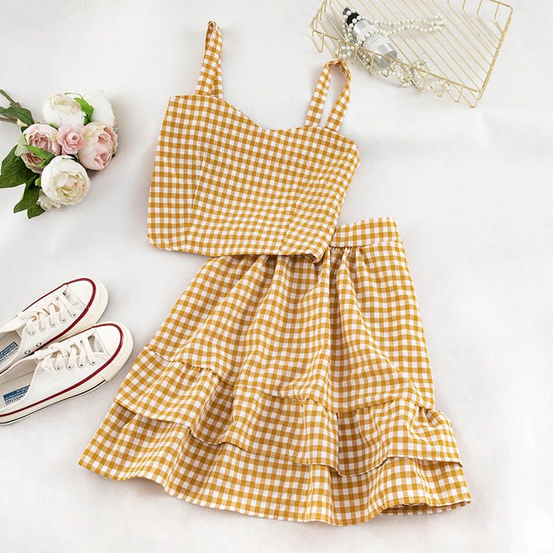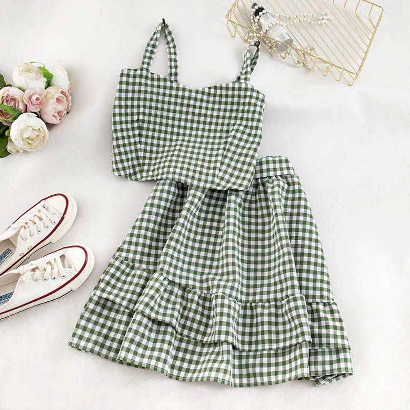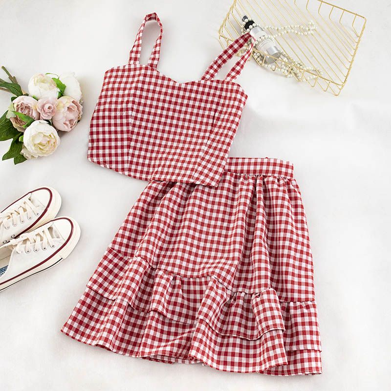 Conjunto de dos piezas de falda con volados y top con tirantes a cuadros